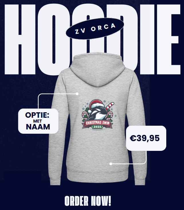 Bestel nu je aandenken aan de Orca Christmas Swim 2025. Een echte hoodie! Deze is verkrijgbaar in diverse kleuren.